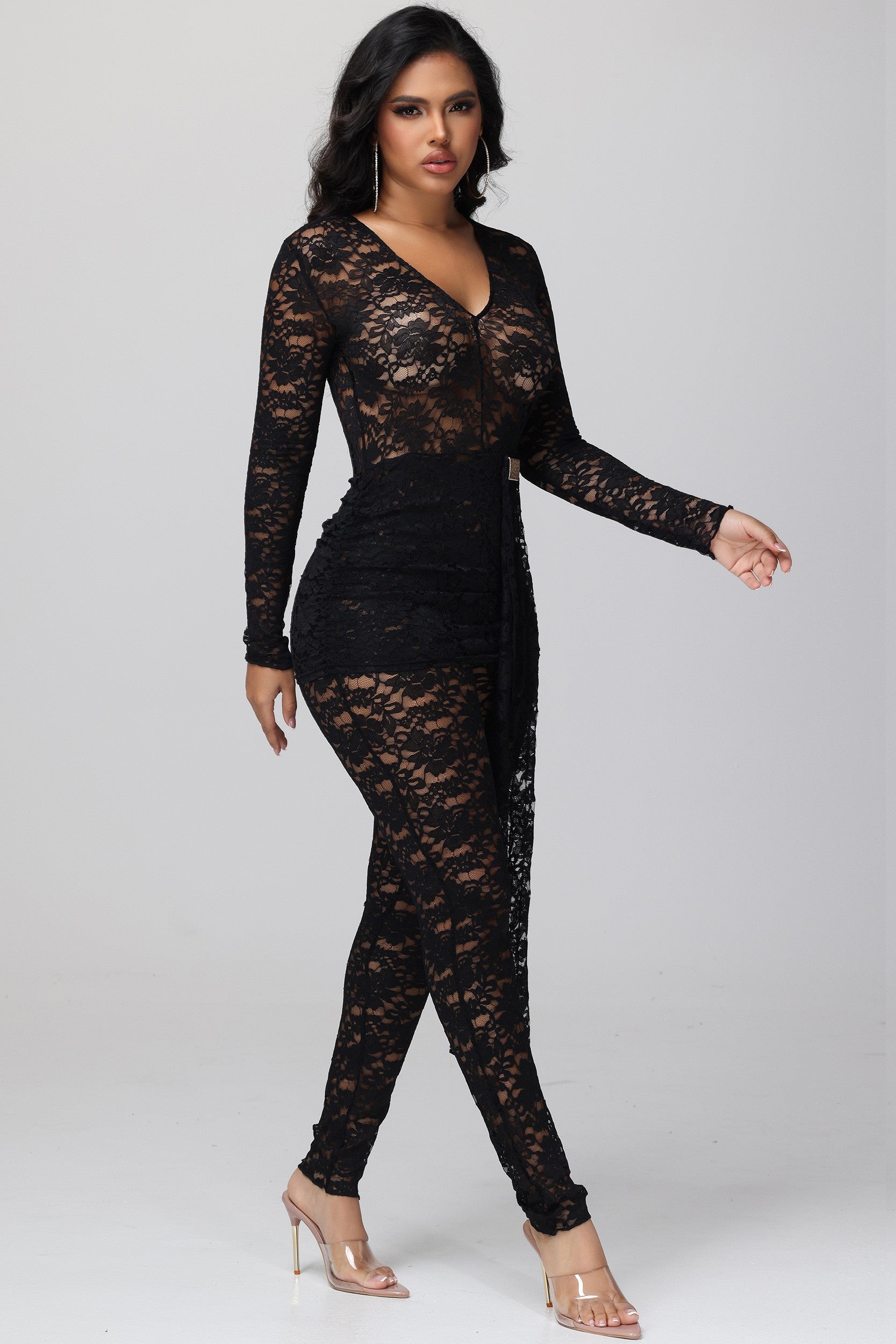 Make a statement in the Kaylia Lace Long Sleeve Jumpsuit—where elegance meets edge. This stunning black lace number features long sleeves that frame your silhouette while the jumpsuit cut keeps things modern and chic. Perfect for date night, cocktail parties, or whenever you want to turn heads. The intricate lace detailing adds just the right amount of allure, while the tailored fit ensures you'll feel confident and fabulous from the office to the dance floor.