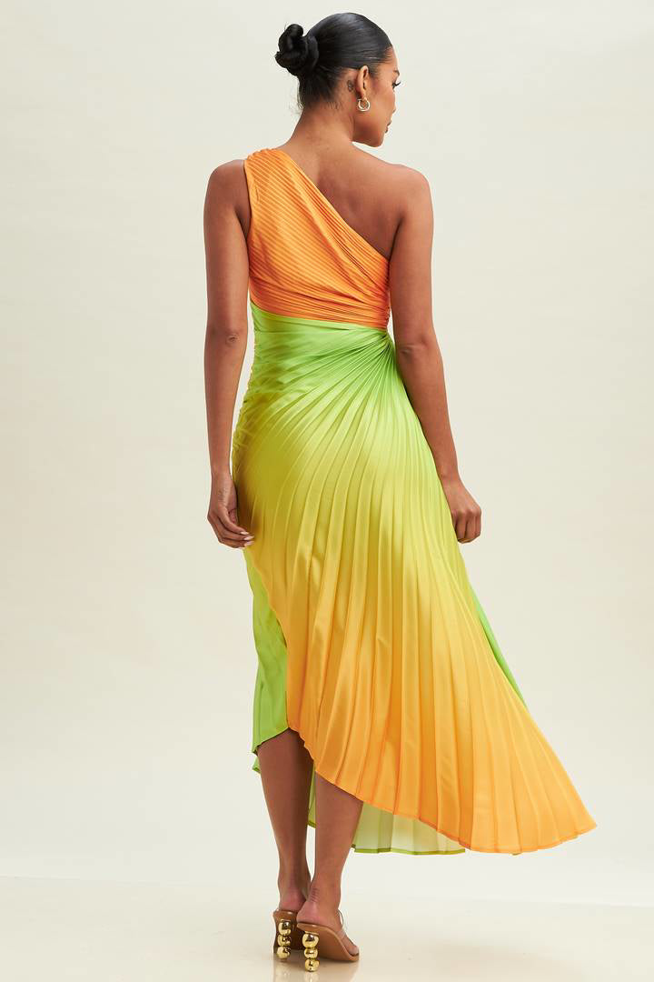 Be the center of attention in our Ombre Pleated Midi Dress! With its vibrant orange color and unique ombre design, you'll stand out in any crowd. The pleated detailing and one shoulder style add a touch of sophistication, making this dress perfect for any occasion. Get ready to turn heads in this trendy and playful piece. (Not just your average dress!)