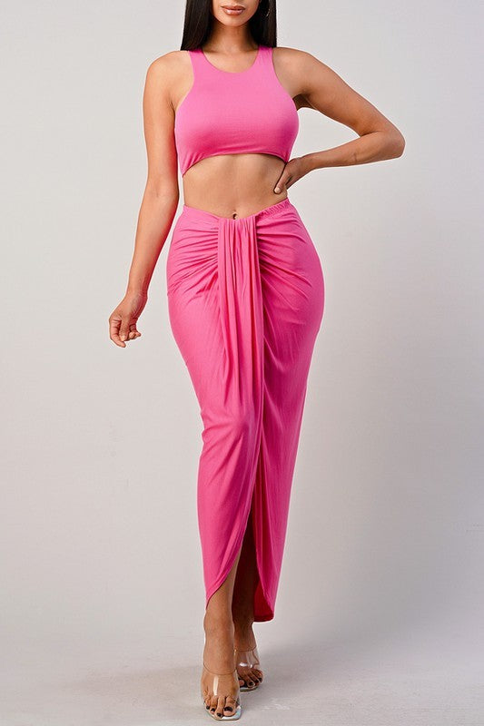 Discover unrivaled style and elegance with the Pink Two Piece Skirt Set from Haute Glam Boutique. An ideal choice for an ultra-glam look, this eye-catching ensemble combines a skirt and crop top constructed from delicate pink fabric for a truly unique and sexy style. Make an unforgettable statement with this show-stopping piece.