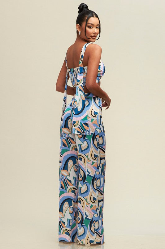Make a lasting impression in this exquisite two-piece set. Featuring a designer-inspired print and unique knot accent, this ensemble will elevate any look. Show off your style with the crop top and matching high waisted pants. Dare to stand out!