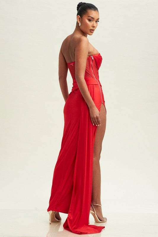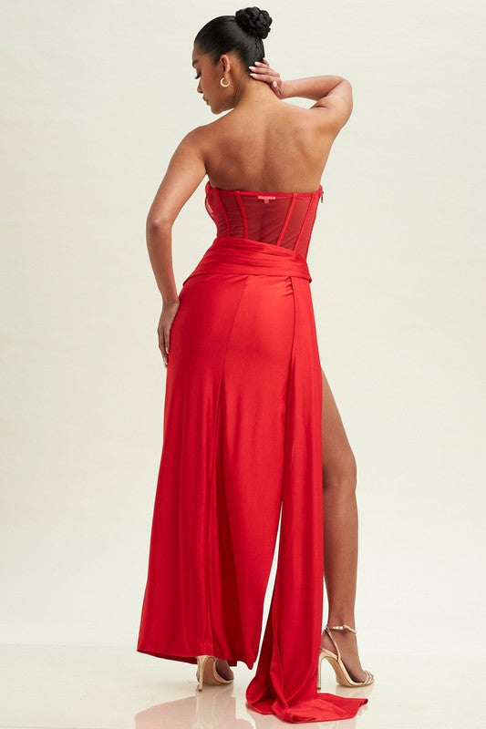 Look stunning in this flirty, red corset gown with an alluring mesh insert! The sultry silhouette will be sure to make jaws drop and hearts flutter! Step out in style and show off your daring side in this maxi dress - your look will be memorable!
